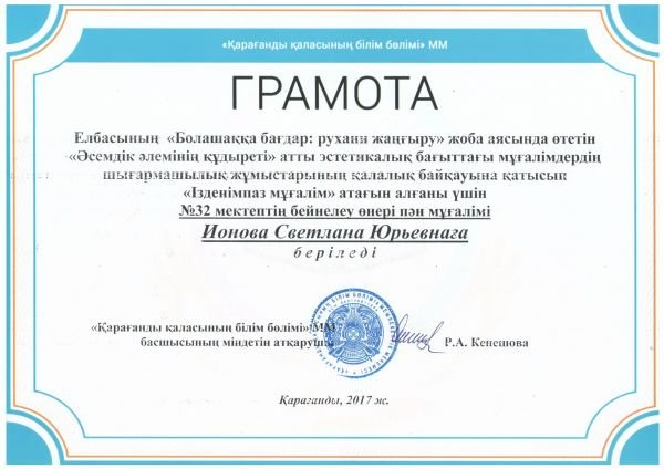 Учителя СОШ №32 приняли участие в городском конкурсе творческих работ учителей эстетического цикла "Әсемдік әлемінің құдыреті".