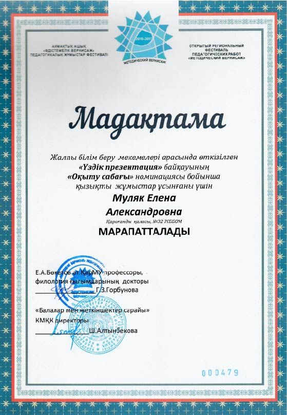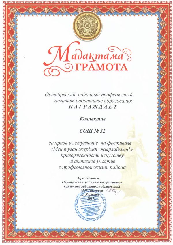 28 марта учителя СОШ №32 выступили на фестивале "Мен туған жерімді жырлаймын!" с музыкальной композицией "Мой Казахстан" и награжден грамотой районного профсоюзного комитета рабо…