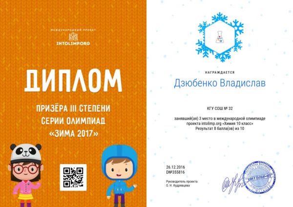 Учащиеся СОШ №32 заняли призовые места в международной олимпиаде проекта intolimp.org "Химия 10 класс":