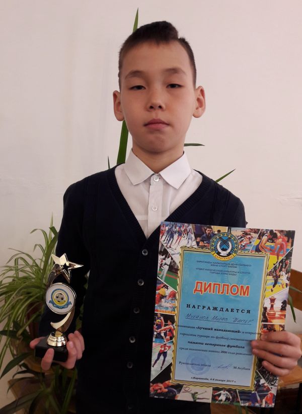 Ученик 4а класса СОШ №32 Муканов Мирас стал лучшим нападающим в открытом городском турнире по футболу, посвщенного памяти ветеранов футбола среди юношеских команд 2006 года рождения.