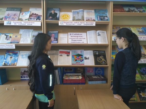 В школьной библиотеке СОШ №32 организована книжная выставка по противодействию коррупции «Сыбайлас жемқорлық – әлеуметтік қастық. Коррупция – социальное зло».