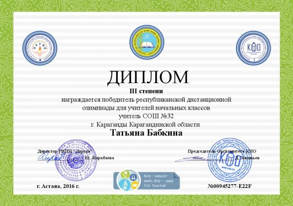Призеры Республиканской дистанционной олимпиады для учителей начальных классов