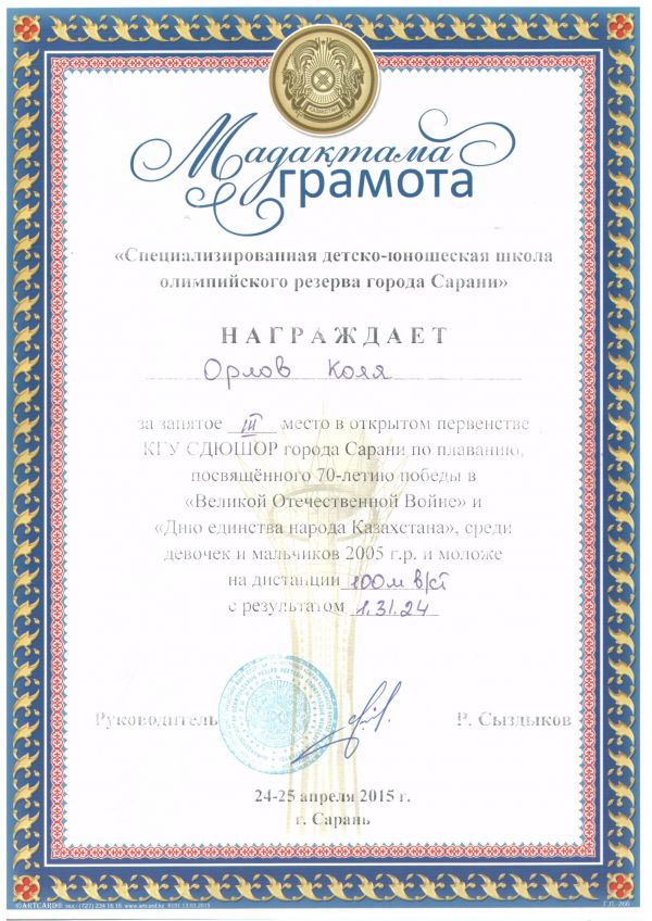 Ученик 4Б класса Орлов Николай занял III место в открытом первенстве КГУ СДЮШОР города Сарани по плаванию, посвященного 70-летию победы в ВОВ и "Дню единства народа Казахстана", среди дево…