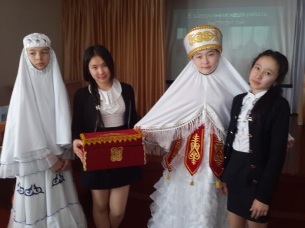 Учащиеся 8 «Ә»класса СОШ №32 заняли I место в городском конкурсе «Историческая реконструкция» в номинации «Национальная одежда». Руководитель: учитель истории Дюс…