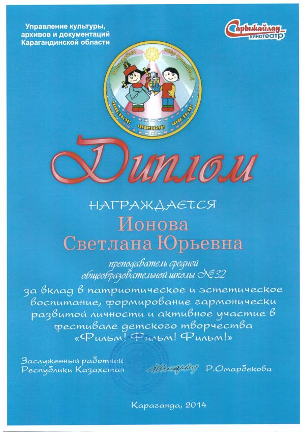В фестивале детского творчества "Фильм! Фильм! Фильм!" приняли участие учащиеся СОШ №32: Топоркова Арина (10Б кл.), Гонтарёва Ольга (6Д кл.), Вантюсова Александра (5А кл.).