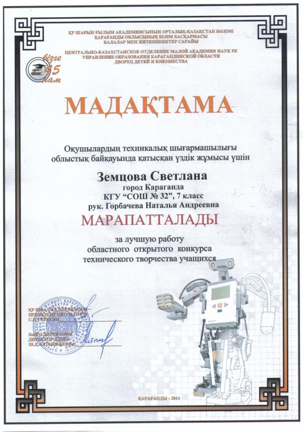 Шағын ғылым академиясының 45 ғылыми-практикалық конференциясына қатысып II дәрежелі дипломмен 1 «Ә» сынып оқушысы Зейлова Альмира марапатталды.