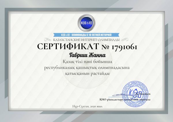 Республикалық Ұлттық Интернет Олимпиадасы Көркем еңбек пәнінен ұйымдастырылған қашықтық олимпиадасы ІІІ дәрежелі диплом, 26 сәуір 2020 ж.