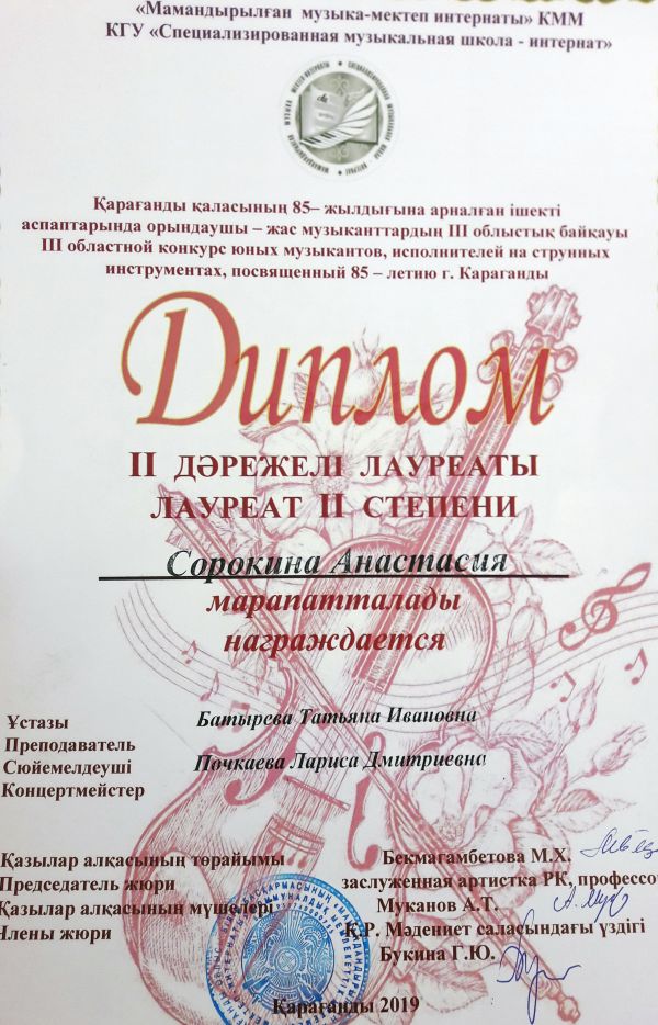 3"б сынып оқушысы Сорокина Анастасия Қарағанды қаласының 85 жылдығына арналған ІІІ облыстық жас музыканттар байқауының шекті құралдардарда орындаушылар арасында ІІ дәрежелі лауреаты атанды.…