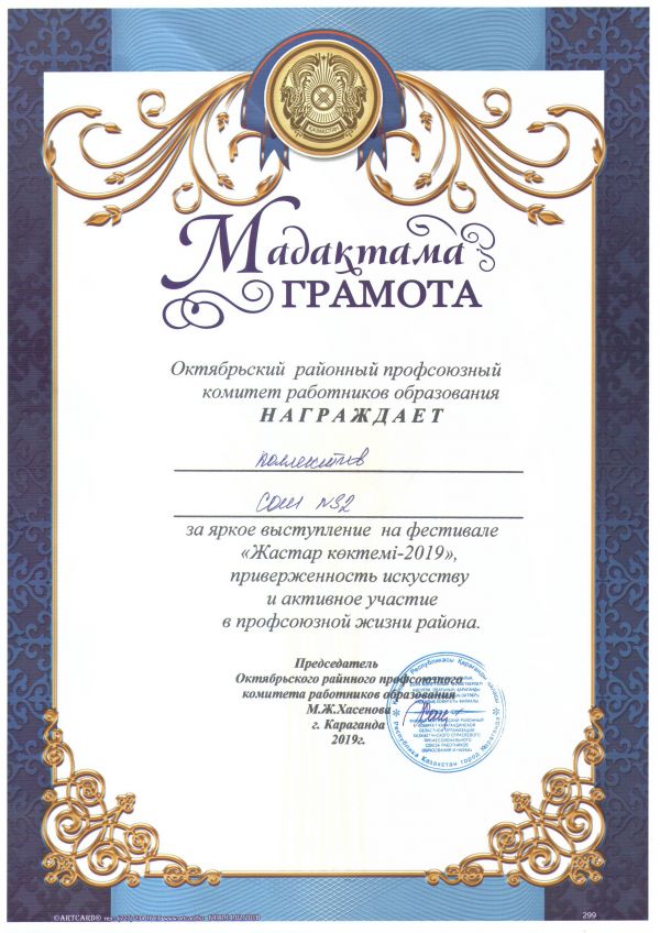 № 32 ЖББОМ ұжымы "Жастар көктемі 2019" фестиваліне қатысты және Октябрь ауданы Грамотасымен кәсіподақ ұйым комитетінің ққызметкерлерінің білім беруде міндеттемесі үшін және ауданның кәсіпо…