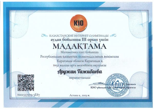 Мухаметалина Дильназ менТажибаева Аружан 7"Ә сынып оқушылары математика бойынша Қарағанды облысының оқушылары арасында Республикалық дистанционды олимпиадада ІІІ орын алды. Мұғалімі Г.А. Салимб…