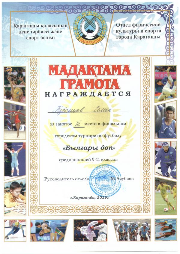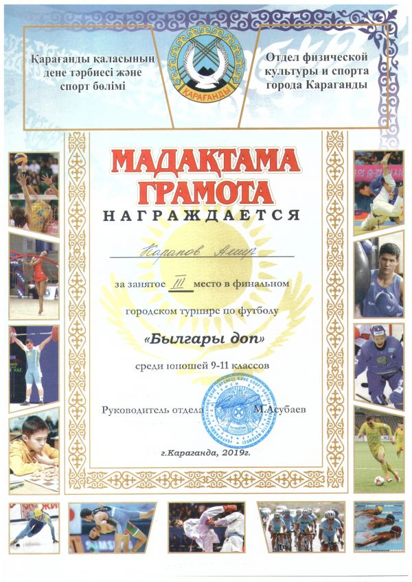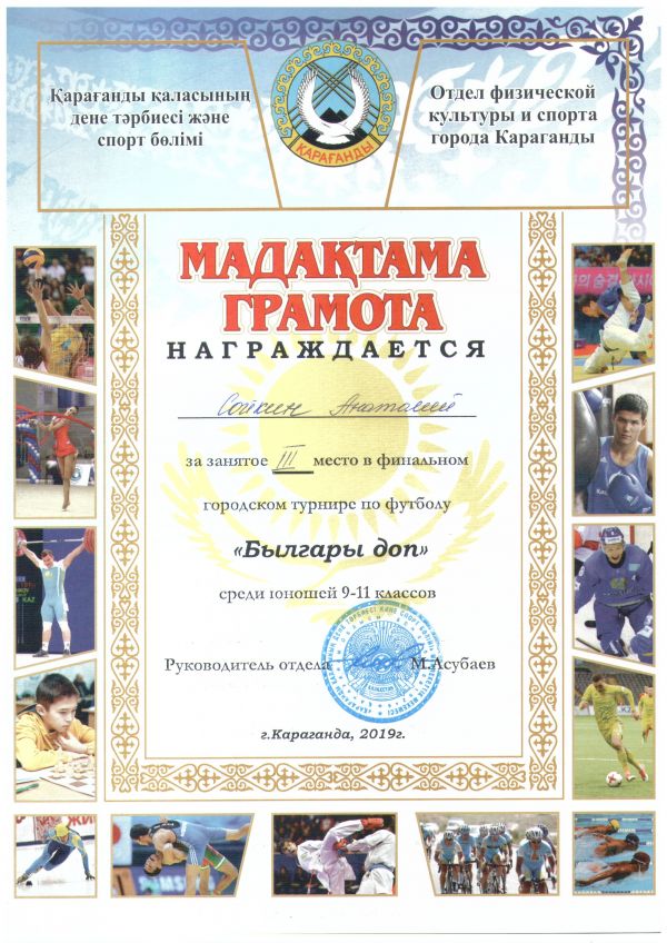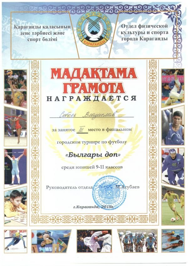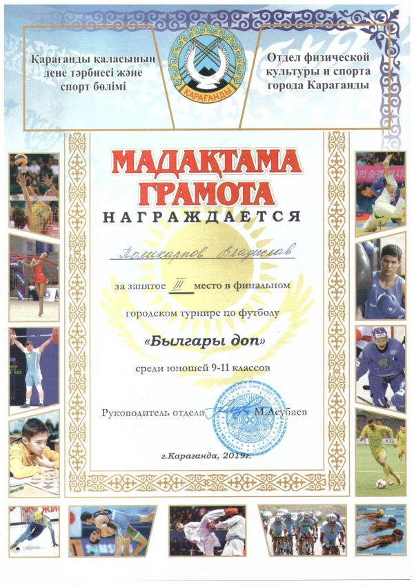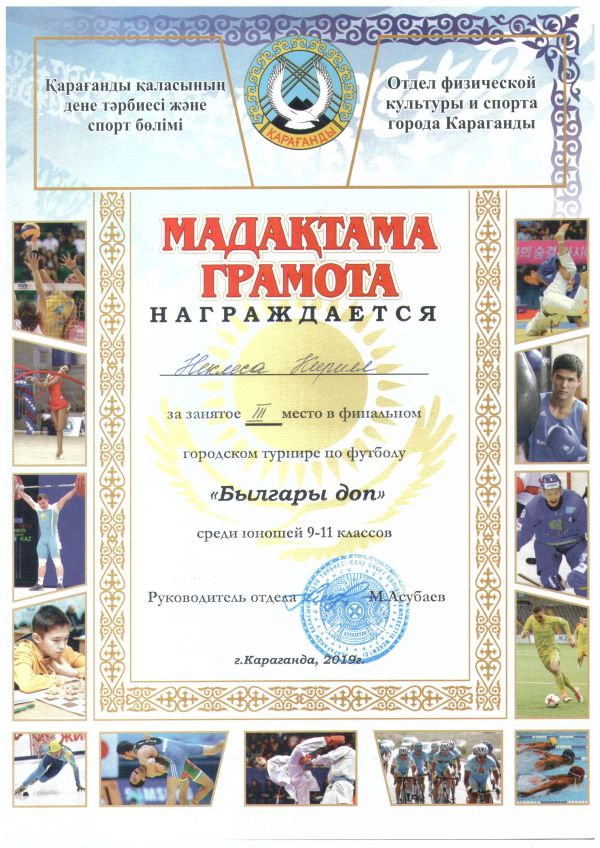 № 32 ЖББОМ жастар командасы 9-11 сыныптар ұлдар арасында "Былғары доп" футболдан финалды қалалық турнирге ІІІ орын алды. Команда құрамы: Вагнер Рудольф Сойкин Анатолий Ионов Константи…