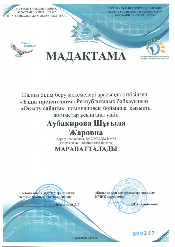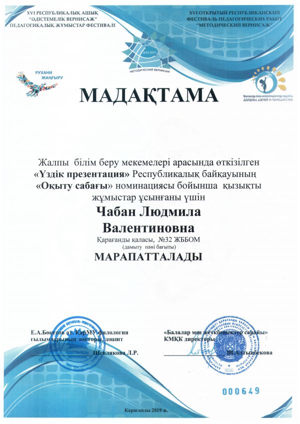 № 32 ЖББОМ КММ мұғалімдері "Әдістемелік вернисаж" педагогикалық жұмыстар Республикалық фестиваліне қатысты және "Оқыту сабағы" номинация бойынша жүлделі орын алды: Воронова Елен…