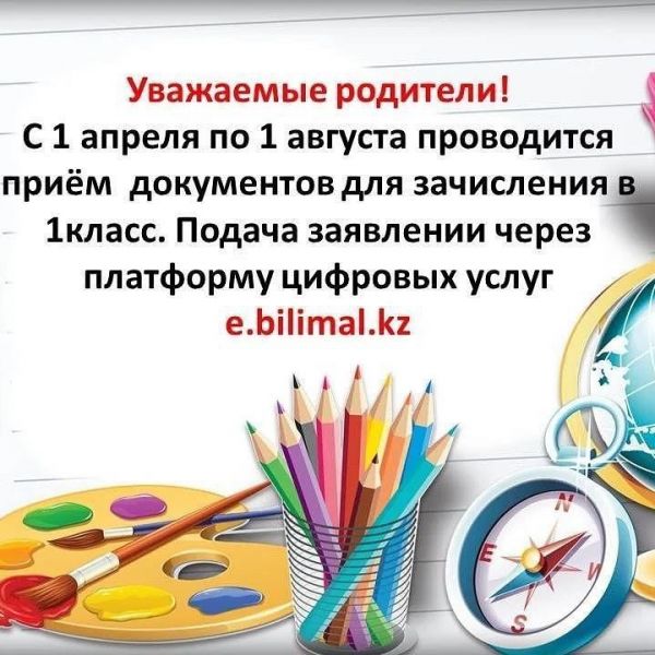 Құрметті ата-аналар! 1 сәуір мен 1 тамыз аралығында 1-сыныпқа қабылдау үшін құжаттар қабылданады. e.bilimal.kz цифрлық қызмет көрсету платформасы арқылы өтініш беру