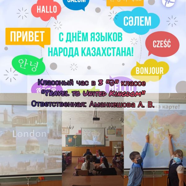 Қазақстан Республикасы Тілдері күні шеңберінде 3 "Ә" сыныбында "Ұлыбританияға саяхат" тақырыбында сыныптан тыс ісшара өткізілді. Жауапты мұғалім Аманкешова А. В.
