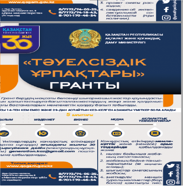 «Тәуелсіздік ұрпақтары» грантын беружөніндегі конкурстың басталуы туралы хабарландыру   Қазақстан Республикасы Ақпарат және қоғамдық даму министрлігі «Тәуелсіздік ұрпа…