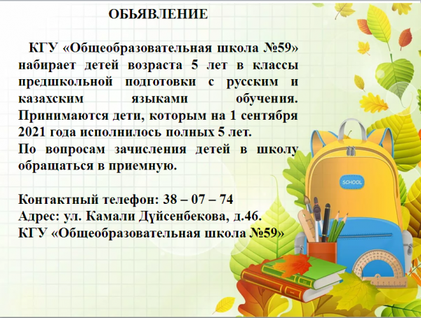 КГУ «Общеобразовательная школа №59» набирает детей возраста 5 лет в классы предшкольной подготовки с русским и казахским языками обучения. Принимаются дети, которым на 1 сентября 2021 го…