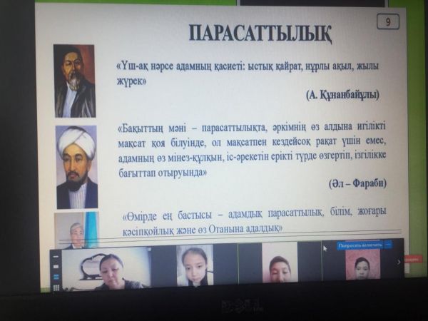 22 қантарда 9 Ә сыныбында онлайн режимде сынып сағаты: "Адалдық пен әдептілік - қалыпты мінез-құлық жағдайы" тақырыбында өткізілді. Сынып жетекшісі Сейлбек Г. К.
