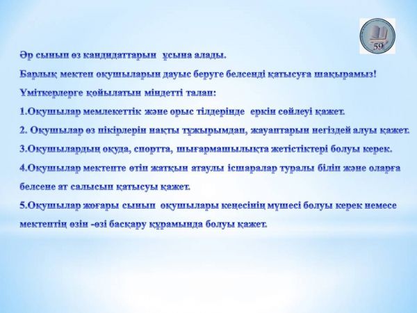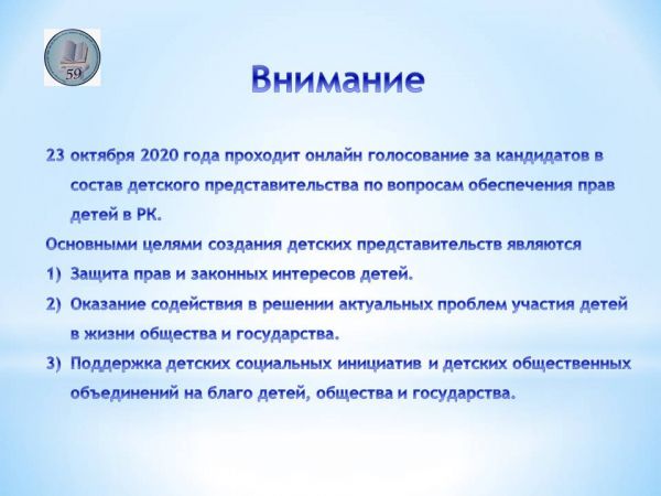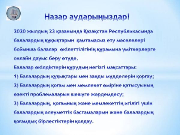 Балалардың құқықтары мен заңды мүдделерін қорғау мақсатында сайлау жолымен балалар өкілдіктерін құру жөнінде жұмыс жүргізілуде. Балалар өкілдіктеріне мектептің неғұрлым белсенді және жа…