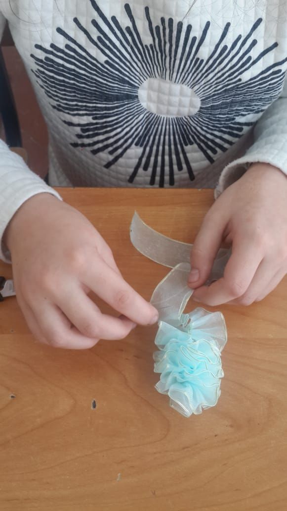 Бүгін 《Қолөнер》 үйірмесі өз жұмысын өткізді. Балалар өз қолдарымен шашқа тағатын бантиктер жасады.