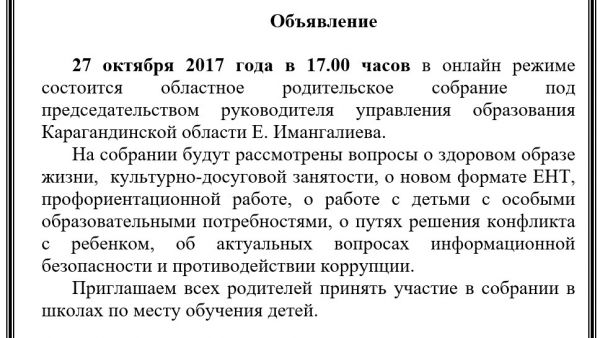 2017 жылдың 27 қазанында сағат 17.00-де онлайн режиміндебілім басқармасының басшысы Е.Иманғалиев төрағалығымен онлайн режимде облыстық ата-аналар жиналысы өткізіледі.