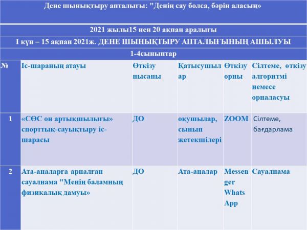 Денешынықтыру апталығы шеңберінде 6 Б және 8 Б сыныптар оқушылары арасында "Дене шынықтыру сауаттылығы - теориялық және практикалық" тақырыбында онлайн режимде сынып сағаты өткізілді. Сыны…