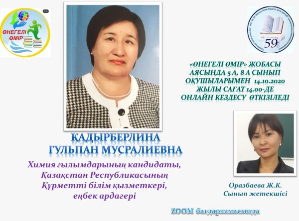 14.10.20 жылы "ӨНЕГЕЛІ ӨМІР" жобасы аясында 5-8 сынып оқушыларымен химик, химия ғылымдарының кандидаты, доцент, "Фитохимия" институты қызметкері, ҚарМУ-дің химия кафедрасын…