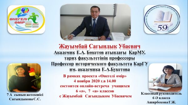 04.11.2020г. в СОШ №59 в рамках проекта "Өнегелі өмір" состоится онлайн-встреча учащихся 6 "ә" и 7 "а" классов с профессором исторических наук КарГУ имен…