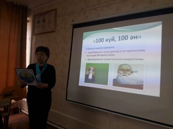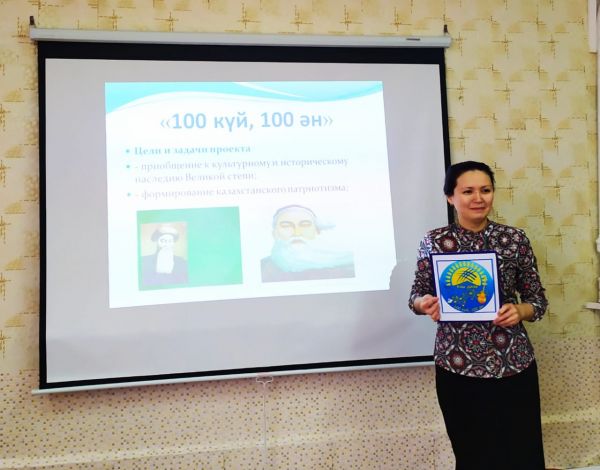 В нашей школе активно работает творческий проект "100 ән, 100 күй" Цель проекта:- приобщение к культурному и историческому наследию Великой степи;