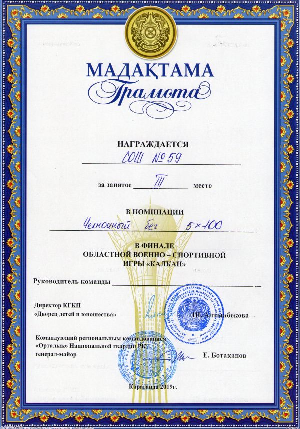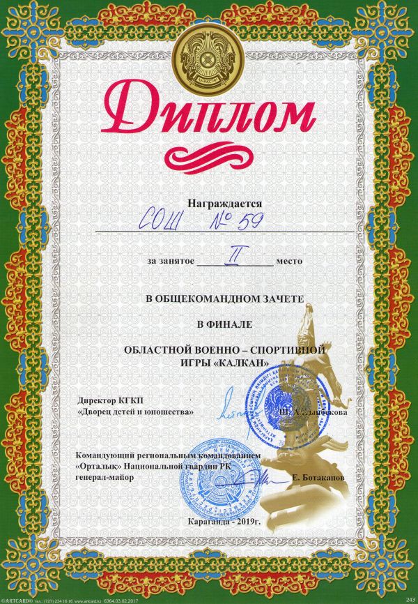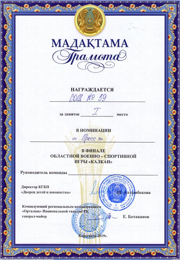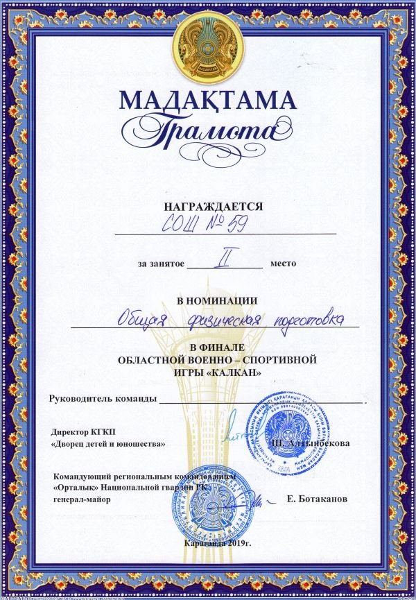 Поздравляем команду учащихся 8-х классав СОШ№59 за занятое 2 место в общекомандном зачете в финале военно-спортивной игре «Калкан».