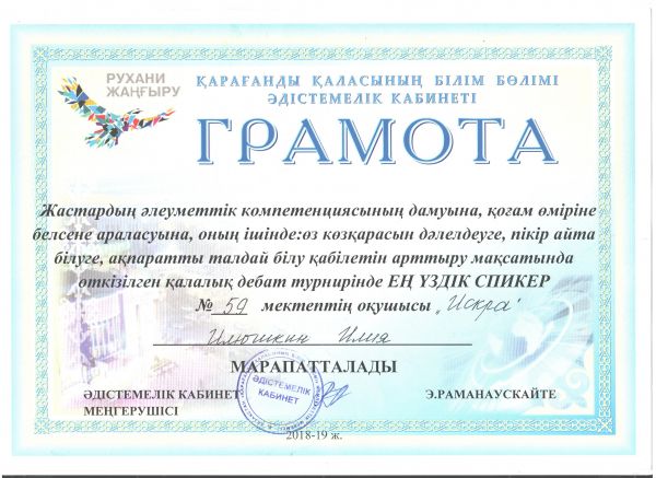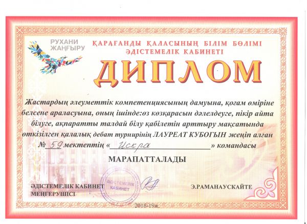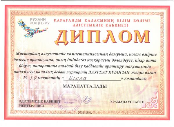 Поздравляем команду «Искра» учащихся 11 класса СОШ№59 завоевавшую Кубок лауреата в городском дебатном турнире. А также, …