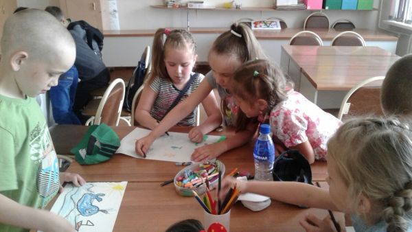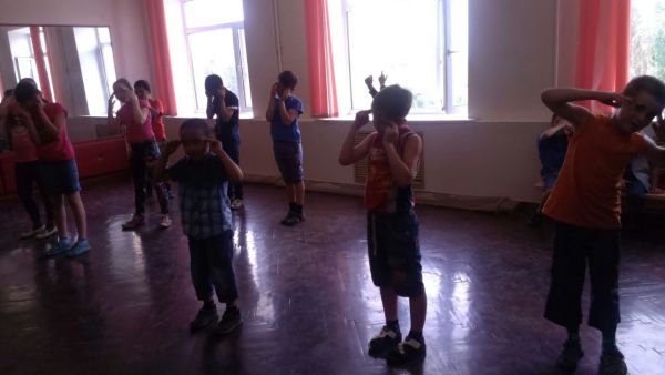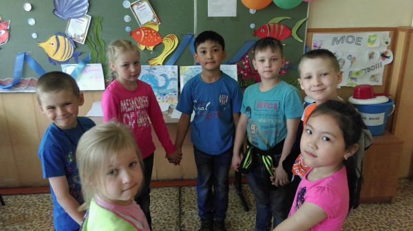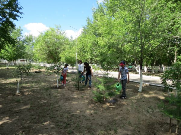 Ученики работают во время трудовой практики на пришкольном участке. Поливают цветы, ухаживают за деревьями. Ученики с удовольствием работают на участке.