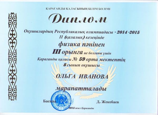 Поздравляем ученицу 9-Г класса КГУ «СОШ №59» Султанову Карину.