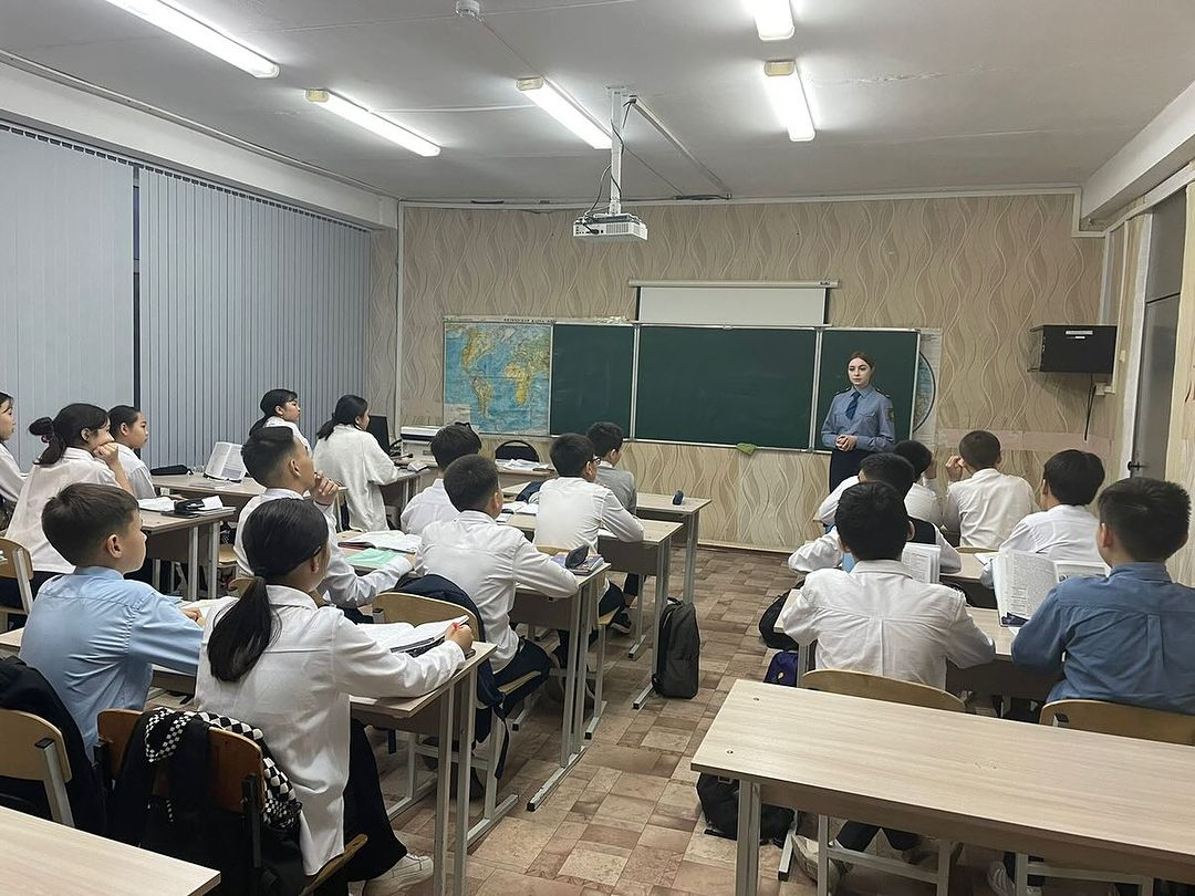 Құқықтық жалпы білім беру аясында жоғары сынып оқушылары арасында құқық бұзушылықтың алдын алу мақсатында полиция подполковнигі О.В.Мельникова «Мектеп – қауіпсіздік аумағы» атты са…