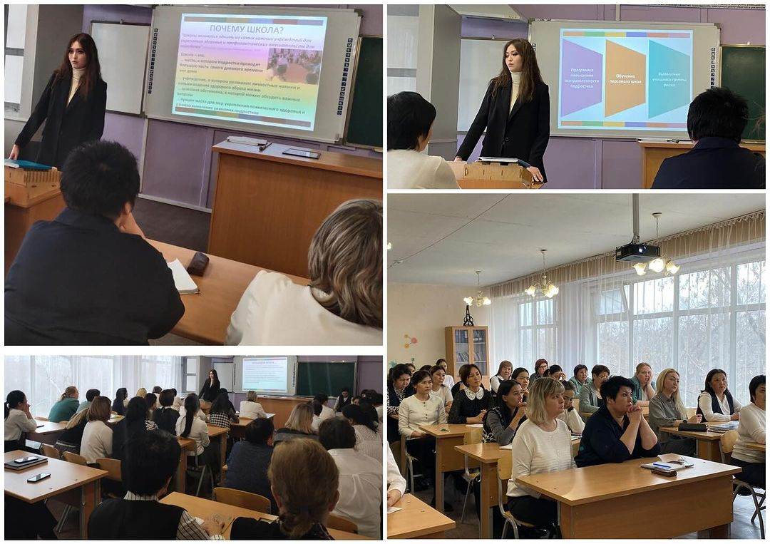 Мектеп психологы кәмелетке толмағандар арасында аутодеструктивті және әлеуметтік мінез-құлықтың алдын-алу бойынша мұғалімдерді ақпаратпен таныстырды.