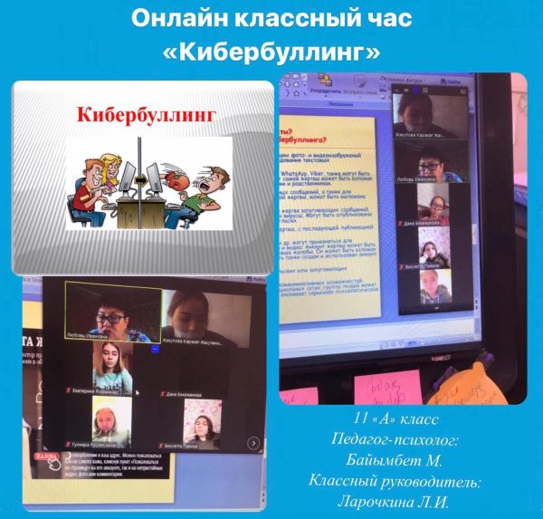 30.11.20ж 11а сынып оқушыларына сынып жетекшісі Ларочкина Л.И.мектеп психологы Байымбет Меруертпен бірлесіп "Кибербуллинг" тақырыбында сынып сағатын өткізді.
