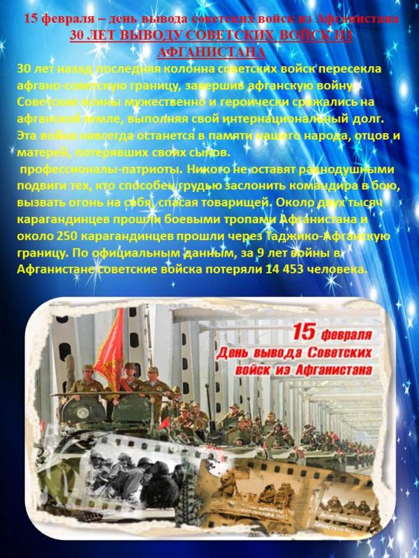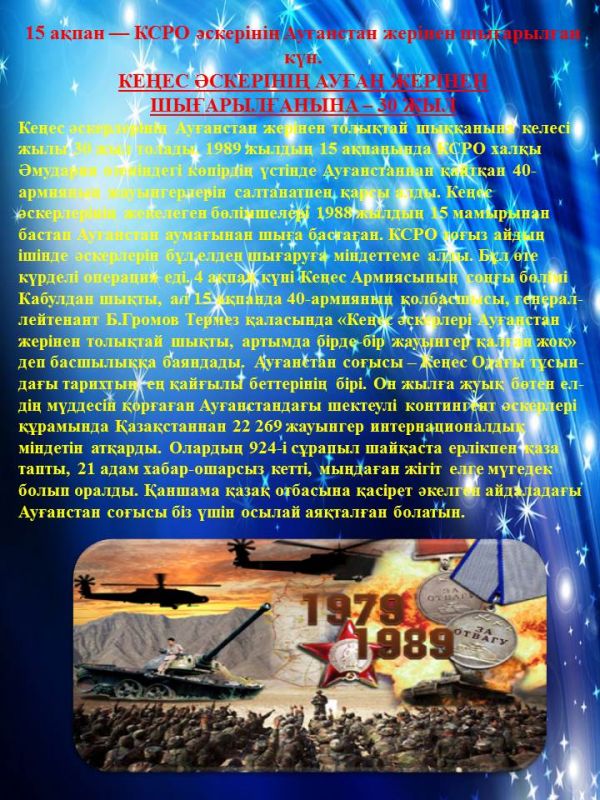 13 ақпанда Ауған жерінен кеңес әскерлерінің шығарылғанына 30 толуы мерекесі қарсаңында 1-11 сыныптар арасында «Ауғаныстан менің жанымды ауыртады» тақырыбында сынып сағаттары өткізілді.