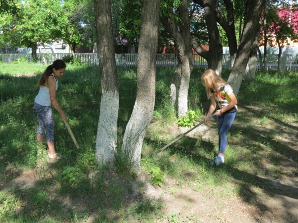 5б сынып оқушылары мектеп ауласында гүлзарларды суарып, жазғы еңбек практикасында қызу жұмыс істеуде...