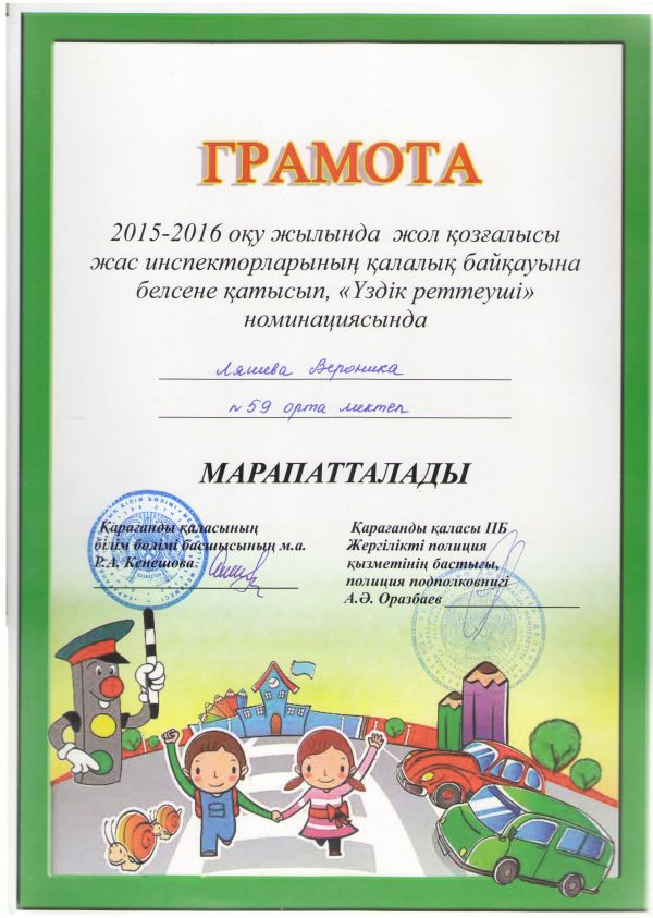 27.04.2016 жылы Жас жолда жүру инспекторларының қалалық байқауына №59 орта мектеп оқушылары командасы белсене қатысты. Ляшева Вероника «Үздік реттеуші» номинациясына ие болды.