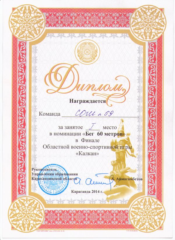 16 мамыр күні №59 ЖББОМ оқушылары Облыстық әскери - спорттық "Қалқан" ойыны байқауынан Финалда - мектептер арасынан Жалпы командалық жүлделі 1-ші орынды жеңіп алды. Барлығы 13 грамота алып…