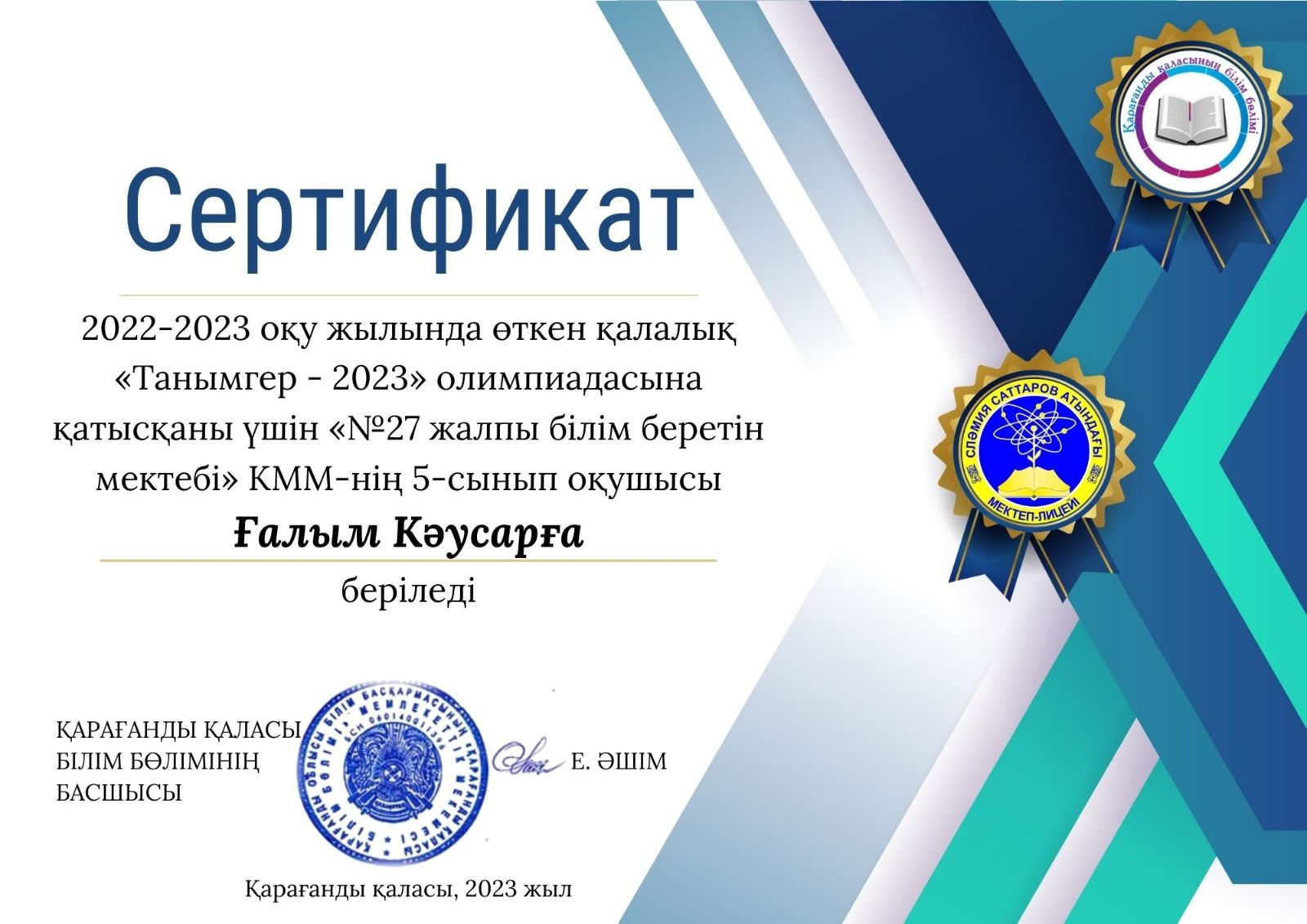 2022-2023 оқу жылында өткен қалалық "Танымгер-2023" олимпиадасына қатысқаны үшін мектебіміздің оқушылары сертификатпен марапатталды.