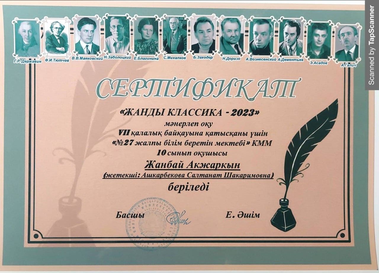 "Жанды классика-2023" мәнерлеп оқу VII қалалық байқауына қатысқаны үшін 10 сынып оқушысы Жанбай Ақжарқын сертификатпен марапатталды. Құттықтаймыз!