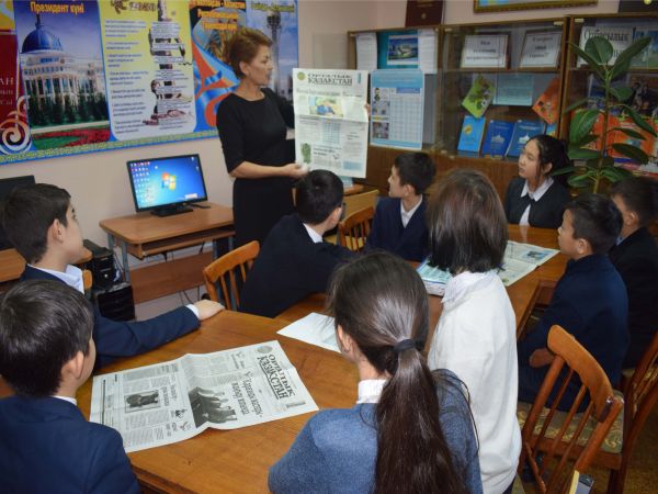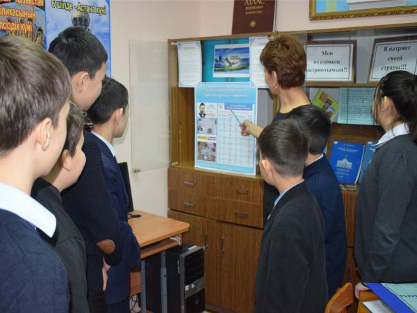 Кітапханашы Л.Д.Дауыпбаева және сынып жетекшісі Ж.Т.Құтжанова 7-сынып оқушыларының қатысуымен кітапханада «Пікірлер қиылысы - латын графикасында қазақ жазуының болашағы» атты іс-ш…