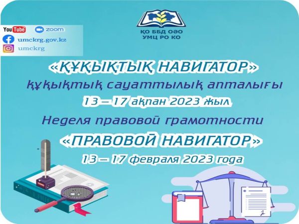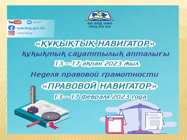 13-17.02.23 күндер аралығында "Құқық навигаторы" апталығы Мақсаты: құқықтық сананы дамыту және құқықтық мәдениетті қалыптастыру, құқықтық сауаттылықты арттыру, заңға құрметпен қарауға тәрби