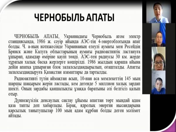 14.04.21 күні 7А сынып оқушыларымен "Чернобыль атом электр станциясындағы апатқа 35 жыл" атты сынып сағаты өтті. Сынып жетекшісі: Ахметова М.С.