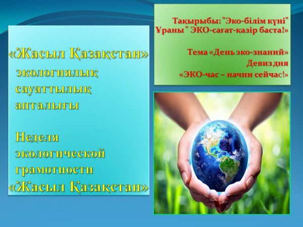 «Жасыл Қазақстан» экологиялық сауаттылық апталығы. Неделя экологической грамотности «Жасыл Қазақстан» Тақырыбы: "Эко-білім күні" Ұраны " ЭКО-…