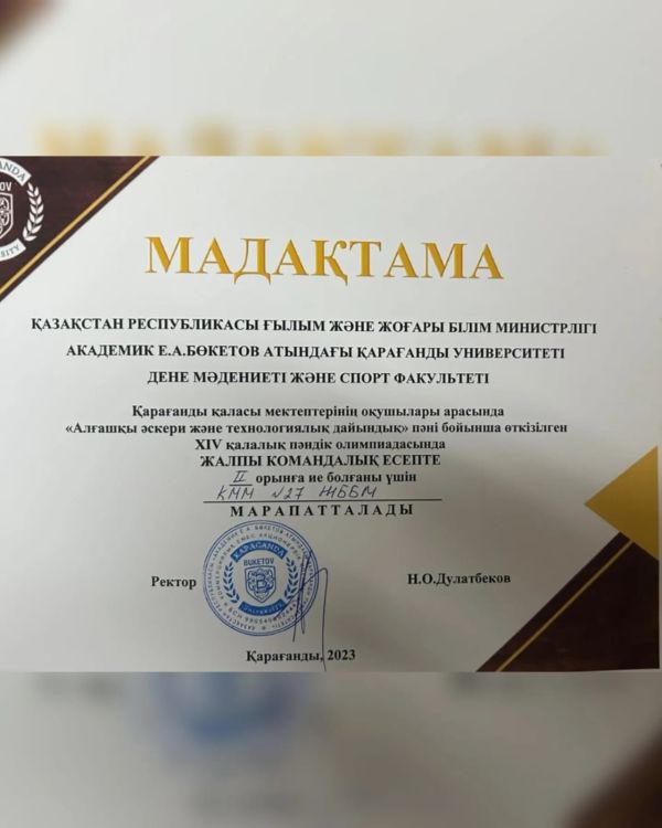 Қарағанды қаласы Е.А.Бөкетов атындағы дене мәдениеті және спорт факультетінің алғашқы әскери дайындық мамандығы кафедрасының ұйымдастырушылығымен қалалық пән аралық сайысқа оқушыларымыз қатысты. Тест сұрақтарына жауап беруден қыздар тобы 1 орын, әскери э