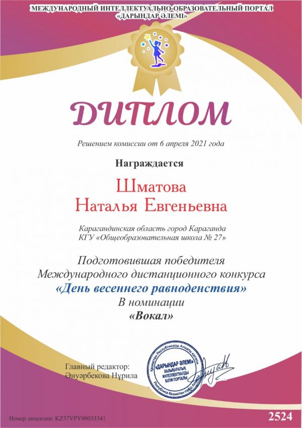 Ученица 6го класса КГУ ОШ27 *НУРЫШЕВА АЛЬМИРА* заняла *ПЕРВОЕ место* в международном Дистанционном конкурсе День Весеннего Равноденствия. АЛЬМИРА не устаёт радовать своими успехами в вокально испол…