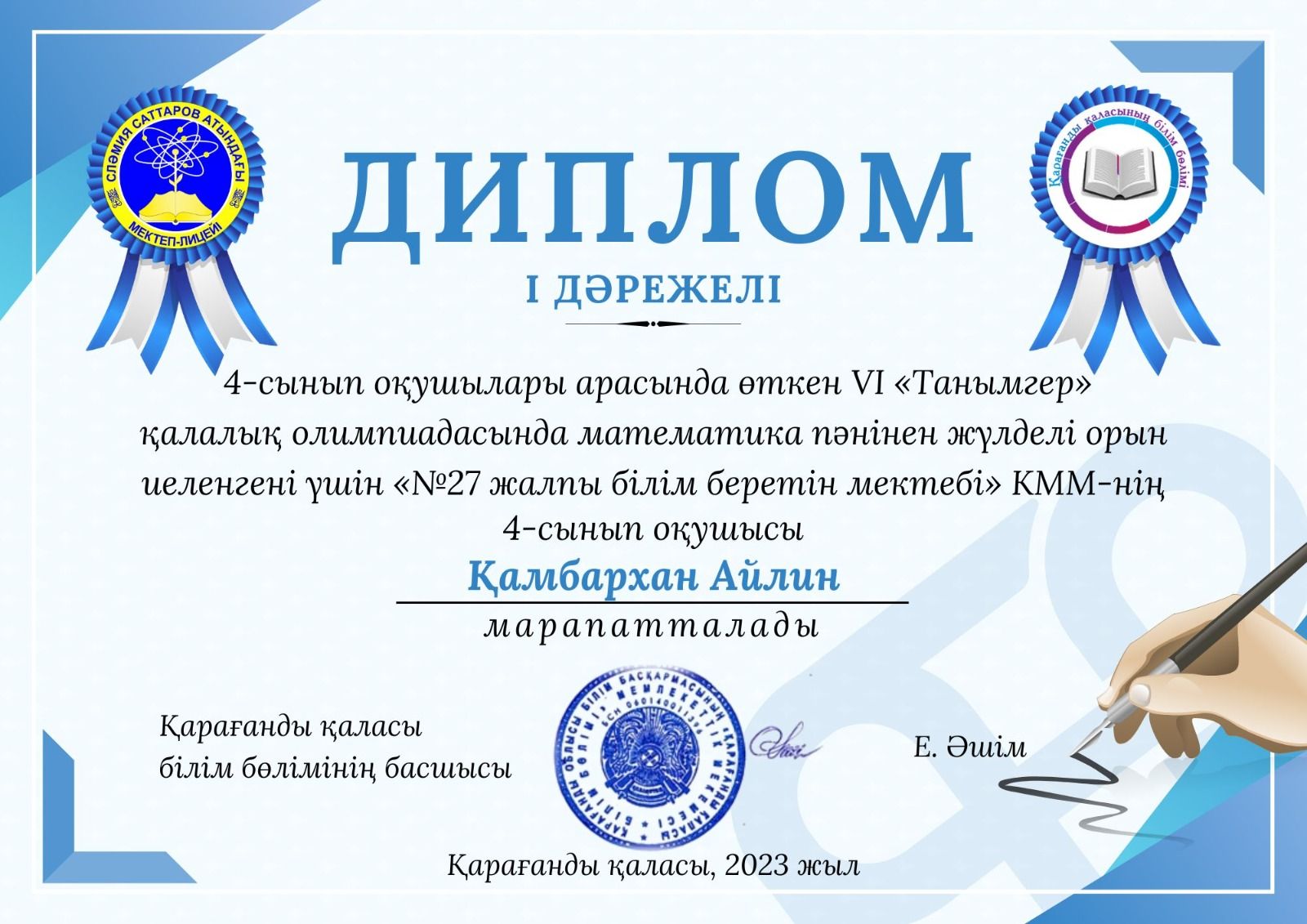 4 сынып оқушылары арасында өткен VI "Танымгер" қалалық олимпиадасында 4 сынып оқушысы Қамбархан Айлин математика пәнінен жүлделі І дәрежелі дипломмен марапатталды! Құттықтаймыз! Сынып жетекшісі: Омаржанова Сабира Сериковна