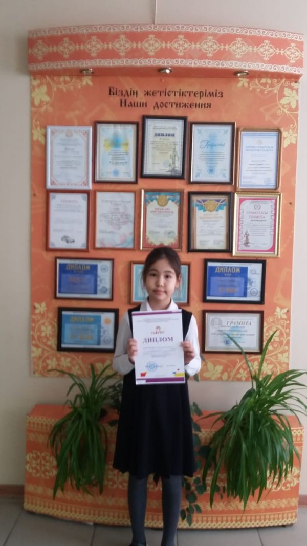 Ученица 4 ғ класса Абдрахманова Данель заняла 3 место в областной олимпиаде "Клевер" по русскому языку. Учитель русского языка и литературы Абильбекова Гульназ Халеловна.
