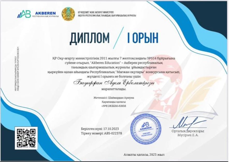 1”Ә” сынып оқушысы Бауыржан Аделя Республикалық “Мағжан оқулары”конкурсына қатысып, 1-орын иеленді, құттықтаймыз. Сынып жетекшісі: Шаймардан Ариуна